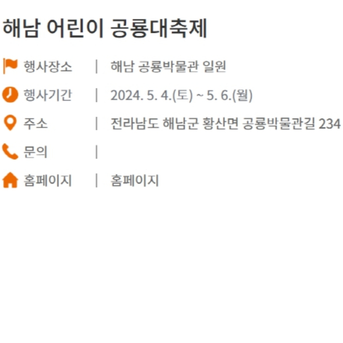5월 가정의 달을 맞이하여 온 가족이 함께 즐길 수 있는 해남공룡박물관에서부터 해남 땅끝마을까지 올해에는 해남 여행을 보내보시는 것을 추천드립니다. 캠핑을 하시는 분들도 잠깐 시간을 내어 아이들과 함께 축제를 즐기시면 좋을 거 같네요.