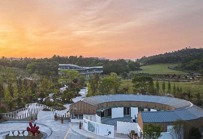 산이정원의 산세를 닮아 물이 흐르듯 자연을 따라 지어진 복합문화공간, 가든 뮤지엄 산이정원과 해남군 일대 자연을 바라보며 즐기는 여가공간입니다.