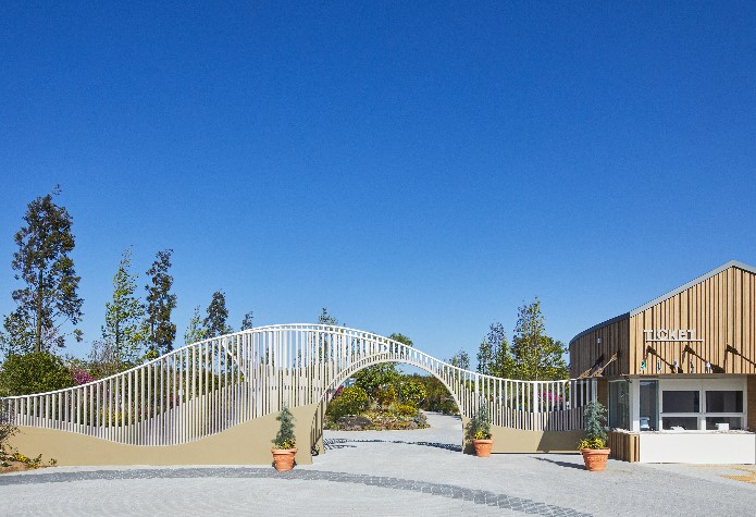 산이정원의 방문을 환영하는 거대한 파도 물결 형상의 게이트입니다.